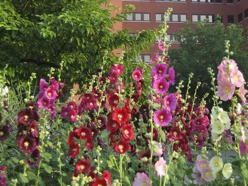 Pink, purple, peach, red, white, yellow or near-black flowers completely cover 8-foot stalks from top to bottom. The large-leaved plants are biennial, which means they live for two years and bloom only in their second year, but they do self-seed, so there will always be more on deck. Plant them in full sun in the north and part shade in hot climates, and provide a fence, trellis or stake for support.