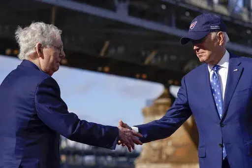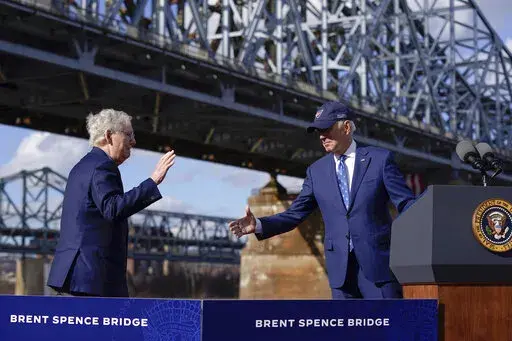 Biden was joined by Senate Republican leader Mitch McConnell — a frequent foil of Democrats — who greeted the president at the local airport and and rode with him in his limousine to the riverfront. McConnell was one of 19 Senate Republicans to support the infrastructure law and has said repairing the Brent Spence has long been a priority.