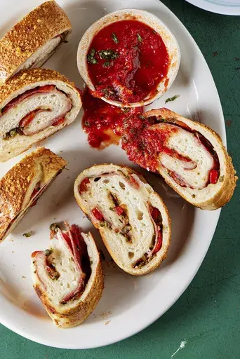 Stromboli is an Italian-American invention said to have been created in Philadelphia in the 1950s, but the dish takes its name from an island off the coast of Sicily. Like the calzone, it’s a sort of portable pizza — fillings are enclosed in dough and baked — but more often than not, stromboli is cylindrical. In this recipe from our cookbook “ Milk Street Bakes,” a sheet of yeasted dough is topped with ingredients, then rolled up and slid into the oven. We use two melty cheeses and sliced salami, all of it layered on a bed of chopped vegetables and herbs. Capers provide brininess; roasted peppers, onion and parsley balance the richness of the meat and cheese. Don’t fill and roll the dough on the counter. The unbaked stromboli is awkward and difficult to transfer, so it’s best to work directly on the baking sheet. After rolling, don’t fold the edges of the stromboli under, or the ends will be too thick and bready. Instead, simply pinch the edges to seal. Finally, be sure to reposition the stromboli diagonally on the baking sheet to give it some room to expand during baking. Slicing reveals tasty spirals of bread and filling. The stromboli is fantastic warm, when the cheese is gooey, but also is delicious at room temperature. Salami and Cheese Stromboli Start to finish: 3½ hours (40 minutes active), plus cooling Servings: Makes one 16-inch stromboli, serving 6 to 8 Ingredients: 445 grams (3¼ cups) bread flour, plus more for dusting 1 teaspoon white sugar 1¼ teaspoons table salt 1 teaspoon instant yeast 2 tablespoons extra-virgin olive oil 1¼ cups warm water (100°F to 110°F) ¾ cup drained roasted red peppers, patted dry and chopped ¼ cup finely chopped red onion 3 tablespoons drained capers, patted dry and chopped ½ cup lightly packed fresh flat-leaf parsley, finely chopped ¼ to ½ teaspoon red pepper flakes 1 tablespoon balsamic vinegar 4 ounces thinly sliced salami 4 ounces sliced provolone cheese, each slice cut into a half circle 4 ounces whole-milk mozzarella cheese, shredded 1 large egg, beaten ½ ounce Parmesan cheese, finely grated (¼ cup) Spicy tomato-basil sauce (recipe follows), to serve (optional) Directions: In a stand mixer with the dough hook, mix the flour, sugar, salt and yeast on medium until well combined, about 15 seconds. With the mixer on low, drizzle in the oil followed by the water. Scrape the sides of the bowl. Mix on medium, occasionally scraping the sides of the bowl as well as the hook, until the mixture forms a cohesive, slightly sticky dough that clears the sides of the bowl, 4 to 6 minutes; the dough will not be completely smooth. Using a silicone spatula, scrape the sides of the bowl and gather the dough in the center. Cover with plastic wrap and let rise at room temperature until doubled, 1½ to 2 hours. Meanwhile, in a small bowl, stir together the roasted peppers, onion, capers, parsley, pepper flakes and vinegar; set aside. About 30 minutes before you are ready to shape and fill the dough, heat the oven to 450°F with a rack in the middle position. Mist a 13-by-18-inch rimmed baking sheet with cooking spray, then line it with kitchen parchment. Mist the parchment, then dust with flour. When the dough has doubled, turn it onto the prepared baking sheet. With the long edge of the baking sheet nearest you, use lightly oiled hands to press and stretch it into an even layer that covers the surface of the baking sheet; it’s fine if the dough doesn’t completely fill the corners. Using a large slotted spoon, spread the roasted pepper mixture in an even layer over the dough, leaving a 2-inch border at the top and a 1-inch border on each short side; discard any liquid remaining in the bowl. Lay the salami slices over the pepper mixture, overlapping them to fit. Layer on the provolone slices, then sprinkle evenly with the mozzarella. Lift up the edge of the parchment closest to you and use it to help fold about 1 inch of the dough over the filling. Continue to roll the dough, without the parchment, until you reach the far edge. Pinch the seam to seal, then pinch the open ends (do not fold them under). Roll the stromboli seam side down and carefully reposition it diagonally on the baking sheet, making sure the seam remains on the bottom. Brush the top and sides with beaten egg and sprinkle evenly with Parmesan. Using a sharp paring knife, cut 5 or 6 shallow diagonal slashes, evenly spaced, into the top so the filling is visible. Bake until well browned and some of the cheese is bubbling through the slashes, 25 to 30 minutes. Using a wide metal spatula, transfer the stromboli to a cutting board and cool for 15 minutes. Use a serrated knife to cut into slices. Spicy Tomato-Basil Sauce Start to finish: 20 minutes Makes about 1⅓ cups In a medium saucepan over medium, combine 1 tablespoon extra-virgin olive oil and 1 medium garlic clove (minced). Cook, stirring occasionally, until the garlic just begins to brown, 1 to 2 minutes. Stir in ½ teaspoon red pepper flakes, followed by one 14½-ounce can whole peeled tomatoes (crushed by hand) with juices, ¼ teaspoon white sugar and ¼ teaspoon each kosher salt and ground black pepper. Bring to a simmer and cook, uncovered and stirring occasionally, until the sauce is lightly thickened, 8 to 10 minutes. Off heat, stir in 2 tablespoons finely chopped fresh basil. Taste and season with salt and black pepper. —— EDITOR’S NOTE: For more recipes, go to Christopher Kimball’s Milk Street at 177milkstreet.com/ap