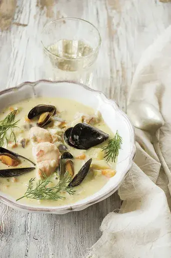 When the vegetables are cooked, add the fish, followed by the thickened cream and stock mixture and the cooked mussels. Bring the soup to a simmer for 5 minutes. Season to taste with salt and pepper.