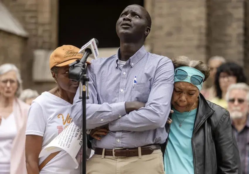 Karissa Bowley, left, stands with her brother, Spencer Bowley, and mother, Bonnie Bowley, as she is consoled during a press conference about the death of her husband, Dau Mabil, in Jackson, Miss., on Friday, June 14, 2024. Credit: Eric Shelton/Mississippi Today