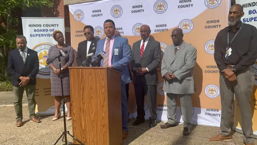 Marshand Crisler, center, executive director of the Hinds County youth detention center, celebrates with county officials Monday, Oct. 31, 2022, the news that the Henley-Young facility is free of federal oversight after decades under a court order because of unconstitutional conditions. Mina Corpuz/Mississippi Today Credit: Mina Corpuz / Mississippi Today