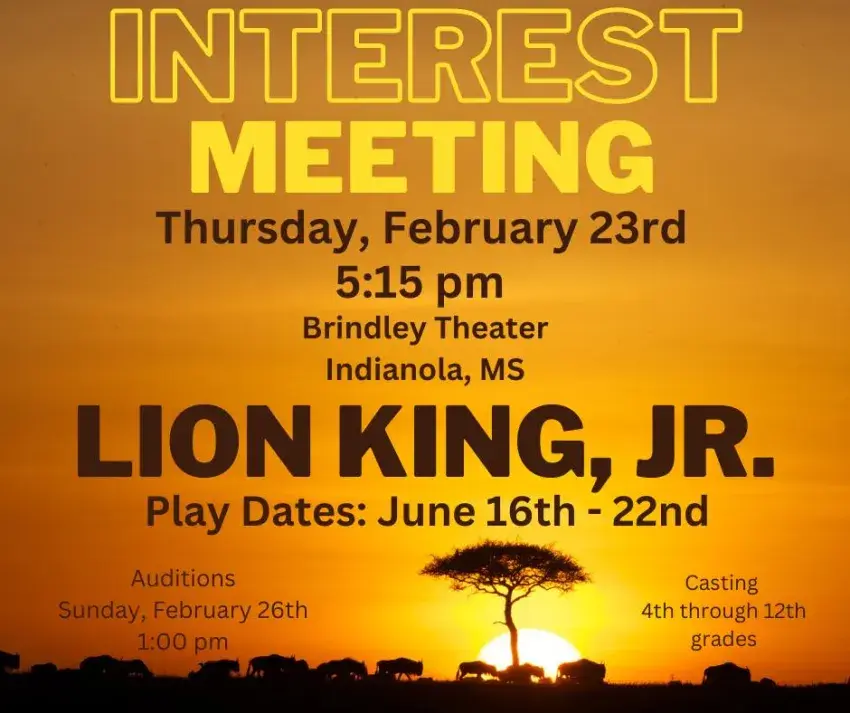 Auditions for Lion King Jr. will be this Sunday, Feb. 26 at 1 p.m. at The Brindley Theater in Indianola. The director is casting for grades 4-12. Play dates will be June 16-22.