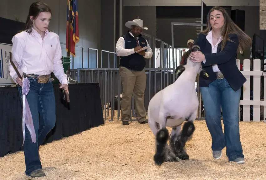 4-H’er Lily Putnam of Sunflower County, right, shows her Mississippi-bred reserve champion lamb at the Dixie National Sale of Junior Champions at the Mississippi Trade Mart in Jackson, Mississippi, Feb. 10, 2022, as sister Emma Grace Putnam looks on. (Photo by MSU Extension Service/Kevin Hudson)