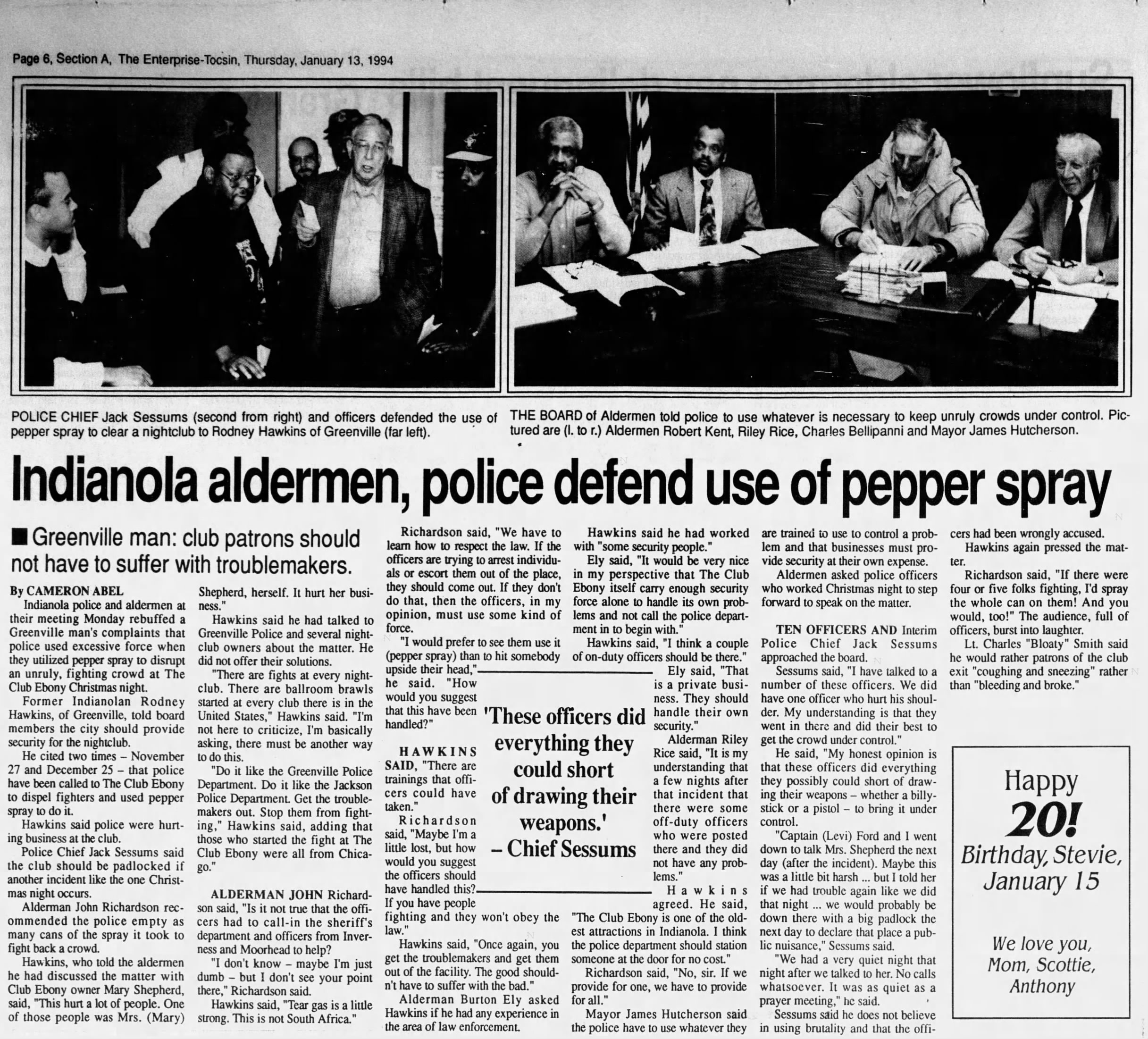 Mrs. Shepard was threatened by then-Interim Chief Jack Sessums with a warning of him having the club closed and labeled a public nuisance. Even though the only alderman who seemed to really be concerned was Mr. Riley Rice (a very smart, concerned, good man), I knew that the only thing I could hope for was that the use of Mace would stop being used at the club if IPD was called. I told the aldermen that Club Ebony would one day be praised and celebrated.