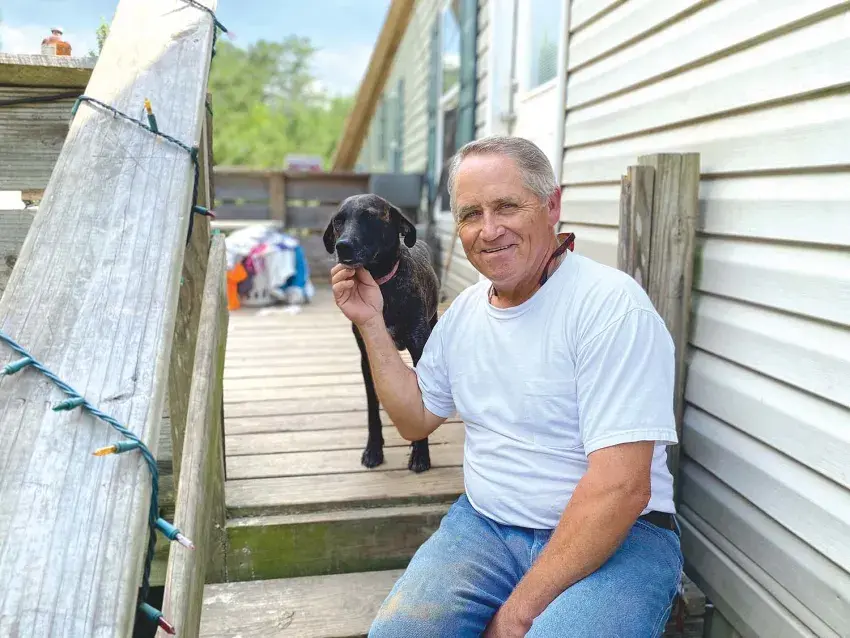 Keith Rice poses for a photo on the steps of his trailer with his dog, Rosebud. She finally came back home after she ran off when his house was overrun by numerous dogs while Natalie Patten housesat for him while he was working out of town for nearly six weeks. Rice returned home to find his home a mess and all four of his dogs missing. They have since returned home. However, Rice is having to clean up the mess and recover from this tragic ordeal. | Brent Maze/The Appeal