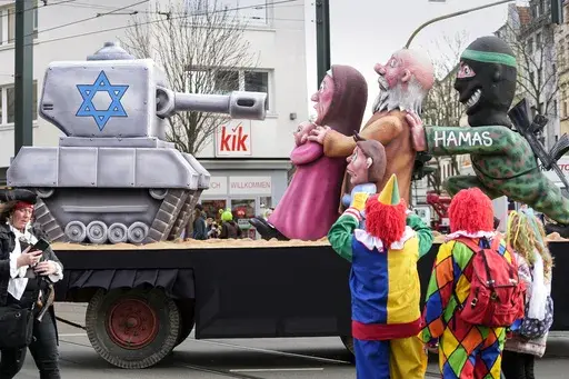 The war between Israel and Hamas was also a theme. A float in Duesseldorf depicted a figure in military garb labeled “Hamas” pushing what appeared to be a family toward an Israeli tank.