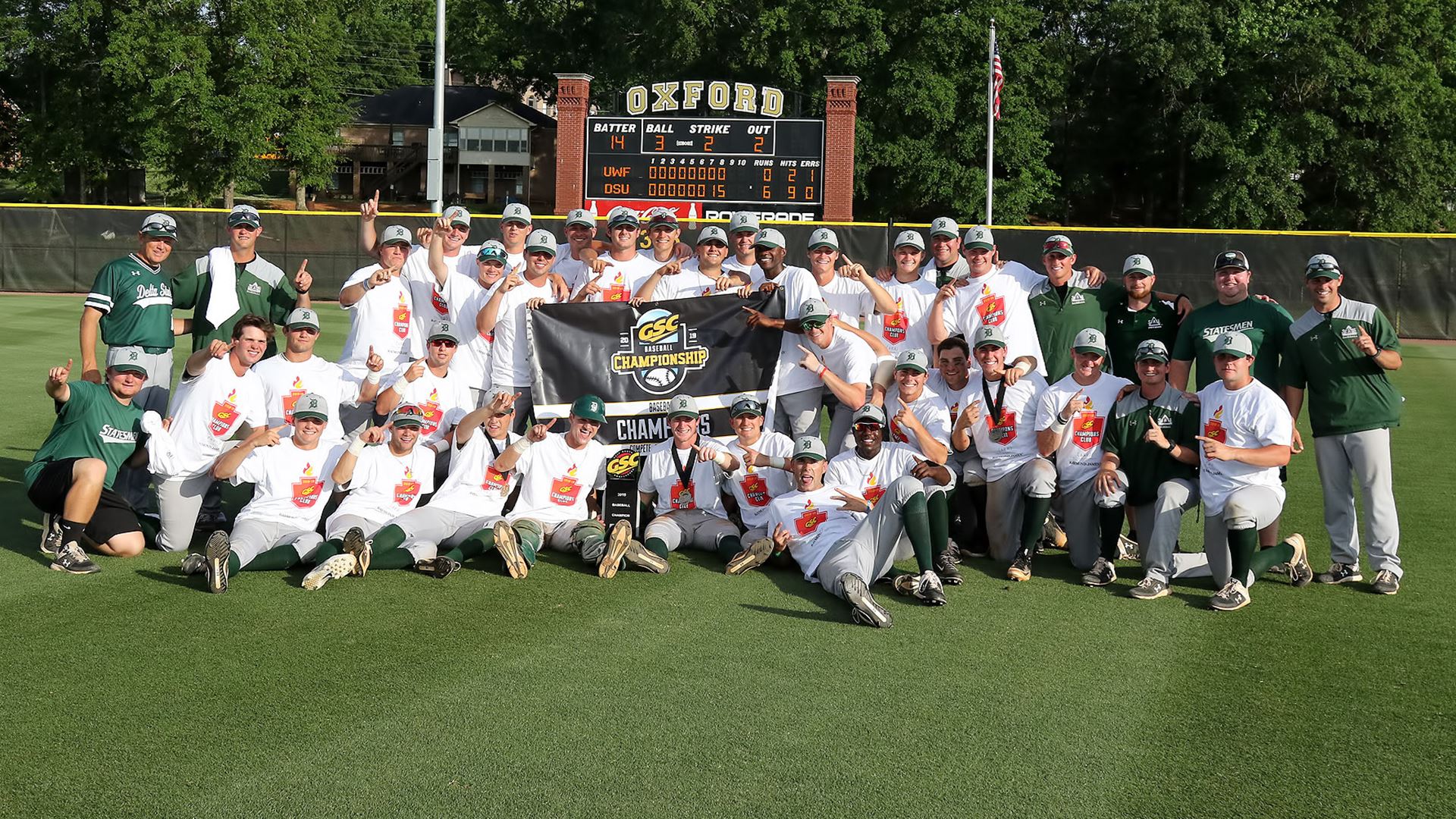 OXFORD, Ala.— Sophomore Hunter Riggins tossed a two-hit, complete shutout to pitch No. 13 Delta State University baseball (39-12) to its 15th Gulf South Conference Baseball Championship with 6-0 win over No. 3 the University of West Florida (36-16) on Tuesday at Choccolooco Park. The GSC baseball ltitle is also the third in the last four years and eighth since 2000.