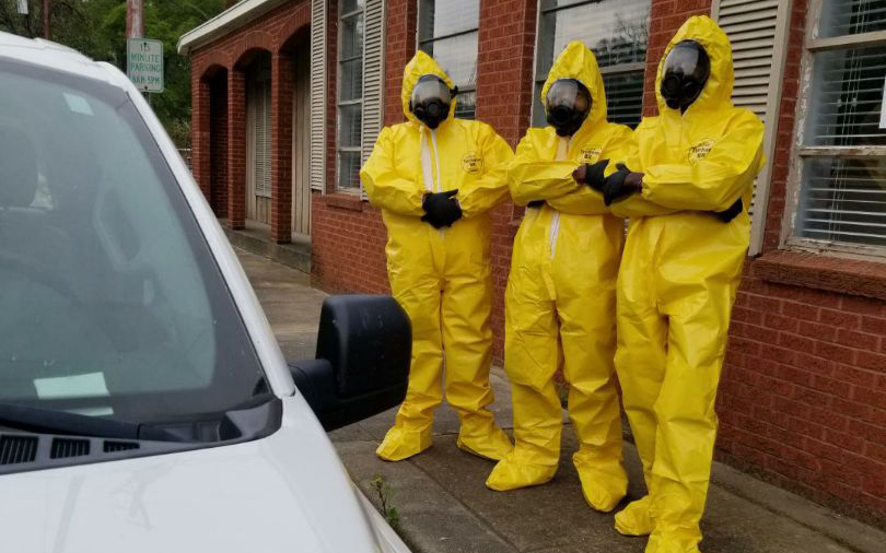 Reportedly, three inmates from the Sunflower County jail donned hazmat suits to disinfect and sanitize the Sunflower County Justice Court Clerk’s offices.