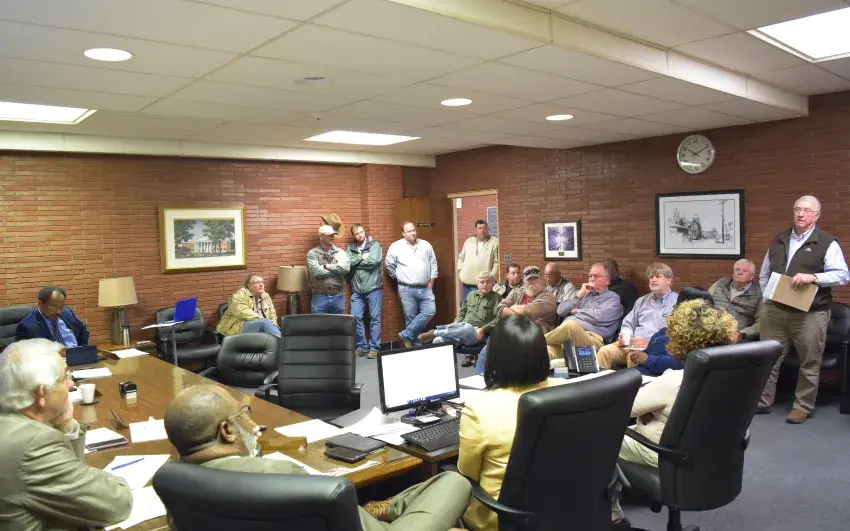 A group of about 15 local farmers and landowners showed up Monday at a public hearing held by the Sunflower County Board of Supervisors to help drive home the point that the large trucks that haul their harvest should not be restricted from travel on Airport Road.