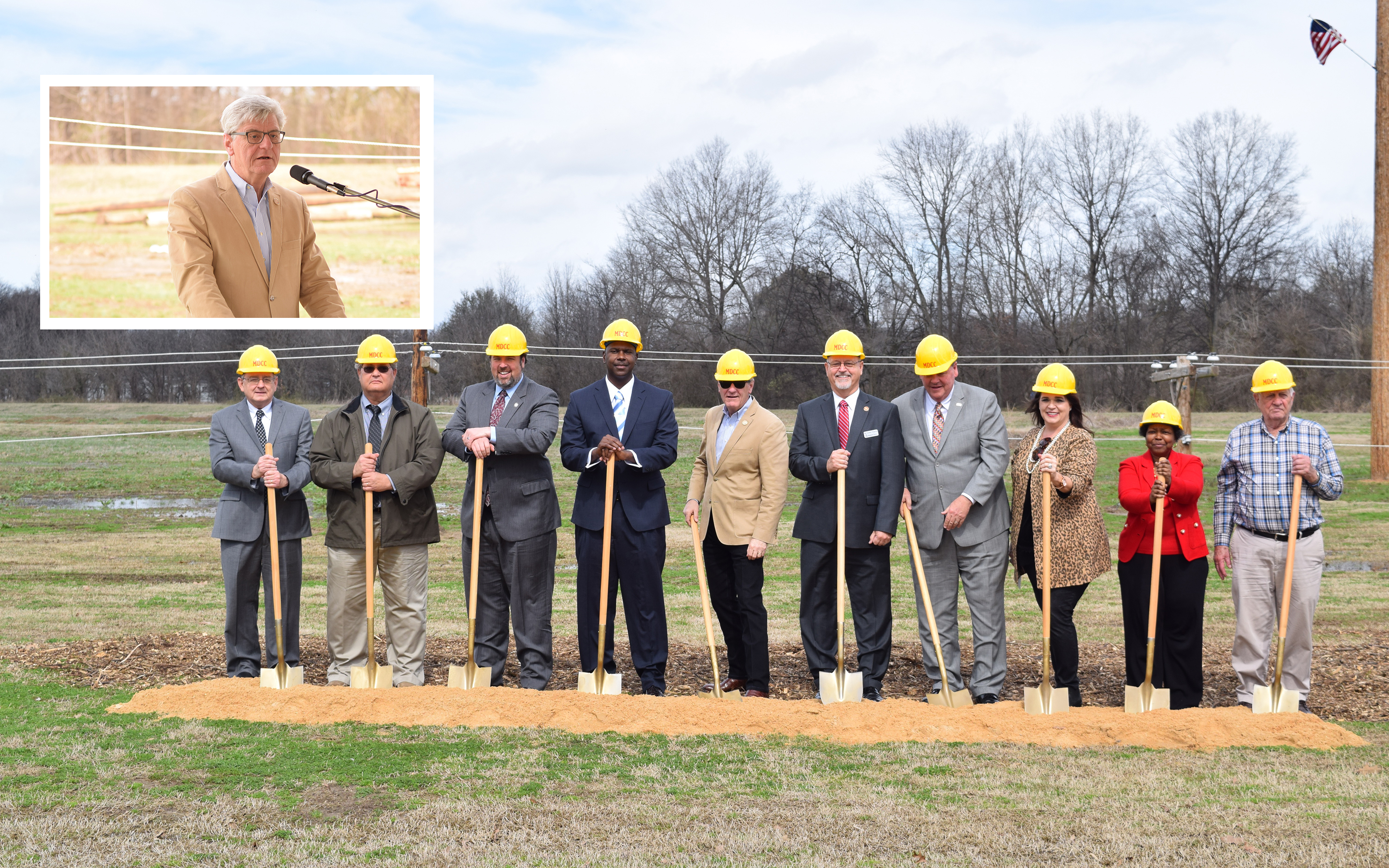 Moorhead native and Mississippi Governor Phil Bryant, flanked by MDCC President Larry Nabors, South Delta Planning and Development Director Tommy Goodwin and their project partners broke ground on a new $348,000 Lineman Training facility on Monday.