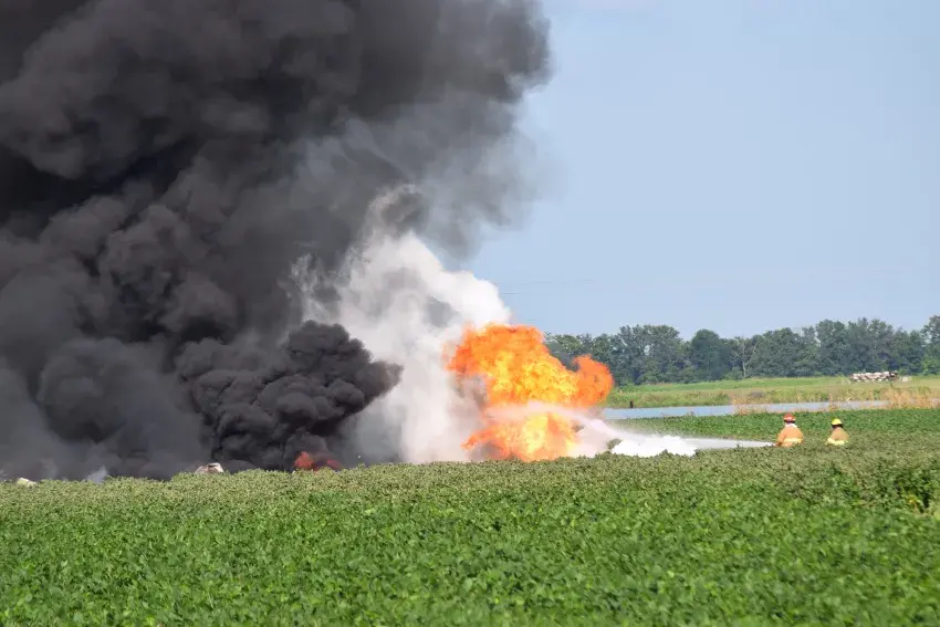The massive, waist-high fields of soybeans hindered getting to the blazing craft. Firefighters had to wait for farm workers to clear a path before approaching the flames to extinguish them.