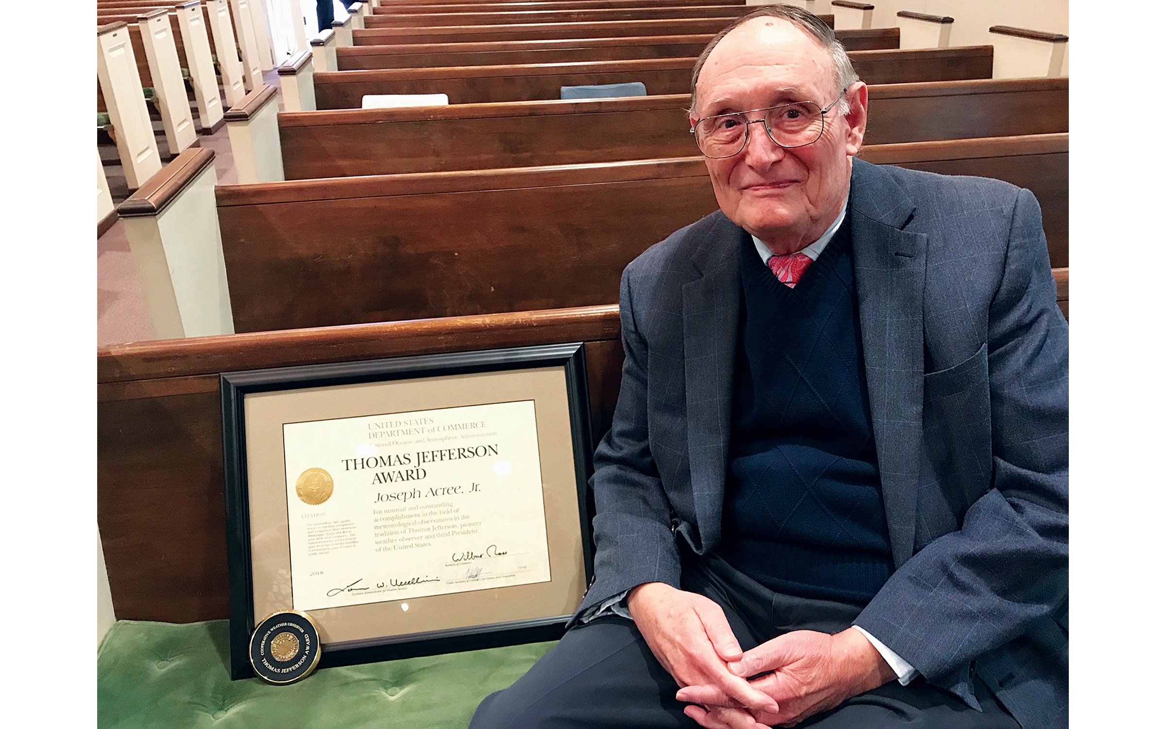 It is ironic that Acree is receiving the award in that his middle name is Jefferson. To be eligible for the Jefferson award, a candidate must have received the John Campanius Holm award, which honors cooperative observers for outstanding accomplishments in the field of meteorogical observations.