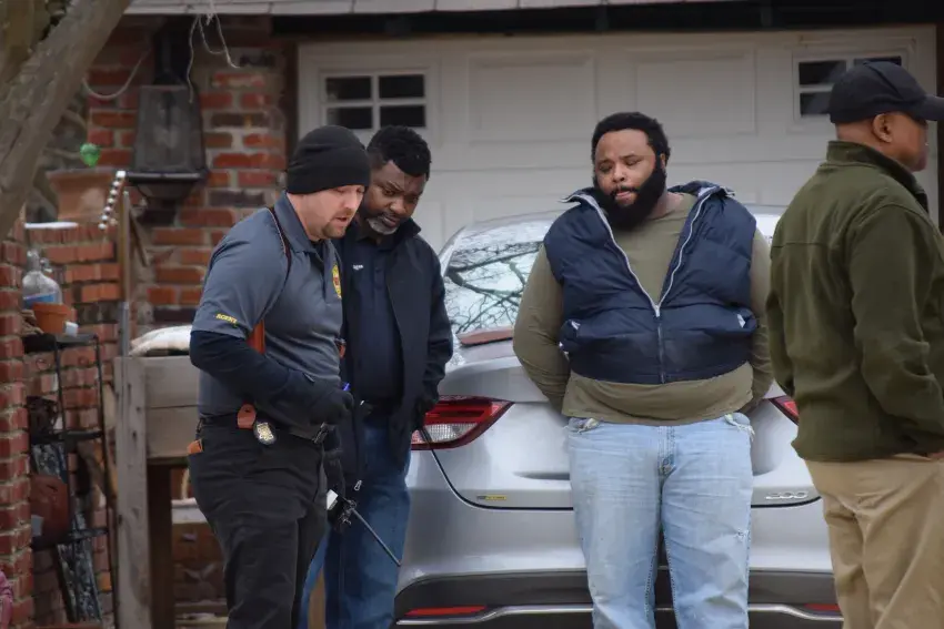 In the photo above, Timothy J. Jones, the individual being held as a person of interest in the MDCC arson investigation is handcuffed next to his vehicle at an Indianola residence, after leading officers on a chase that began in Moorhead. (Photo by Recardo Thomas)