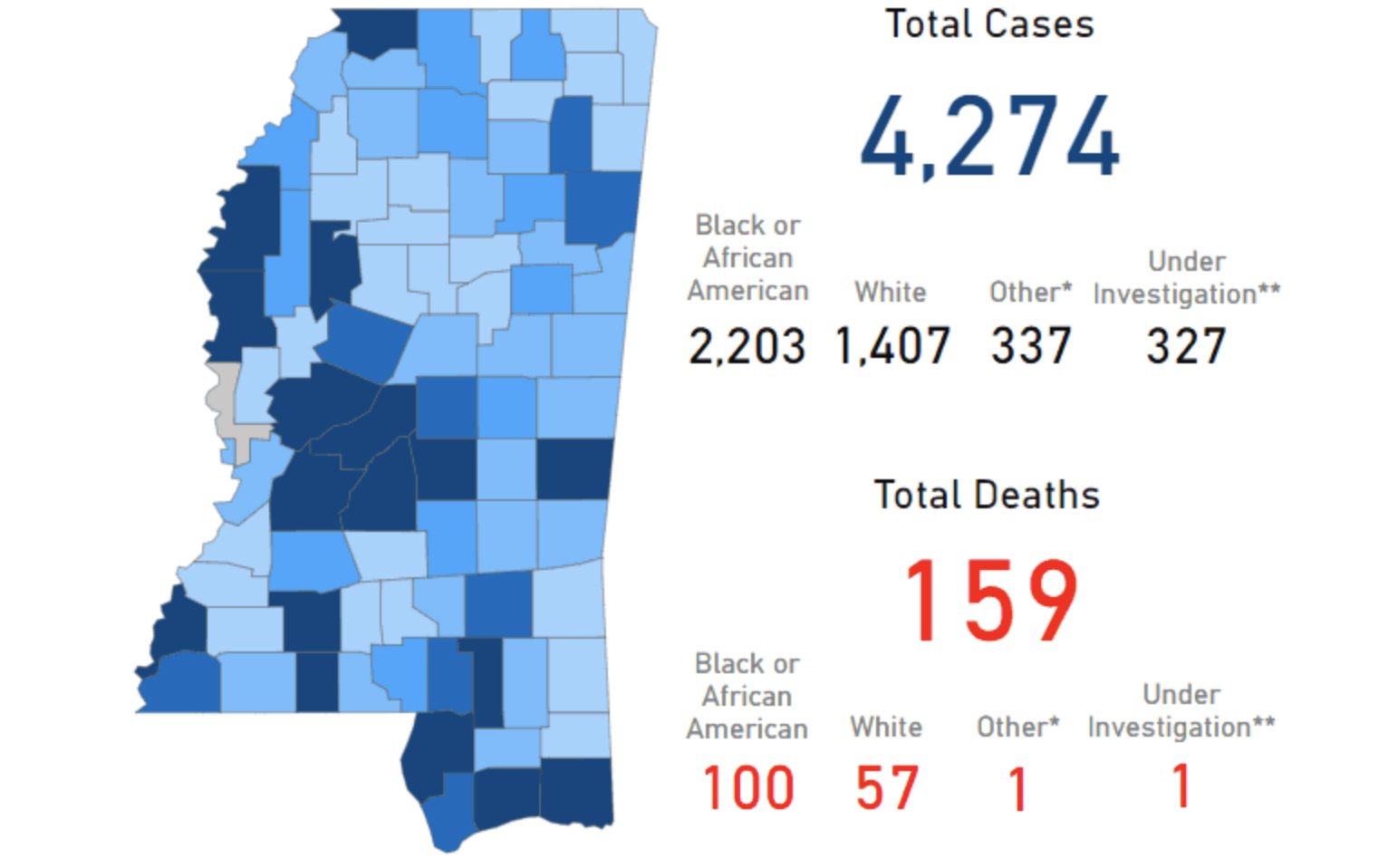 The MSDH says just over 50,000 people have been tested statewide for the virus, and 4,274 people had tested positive by Sunday. There have been 159 confirmed fatalities related to the illness.