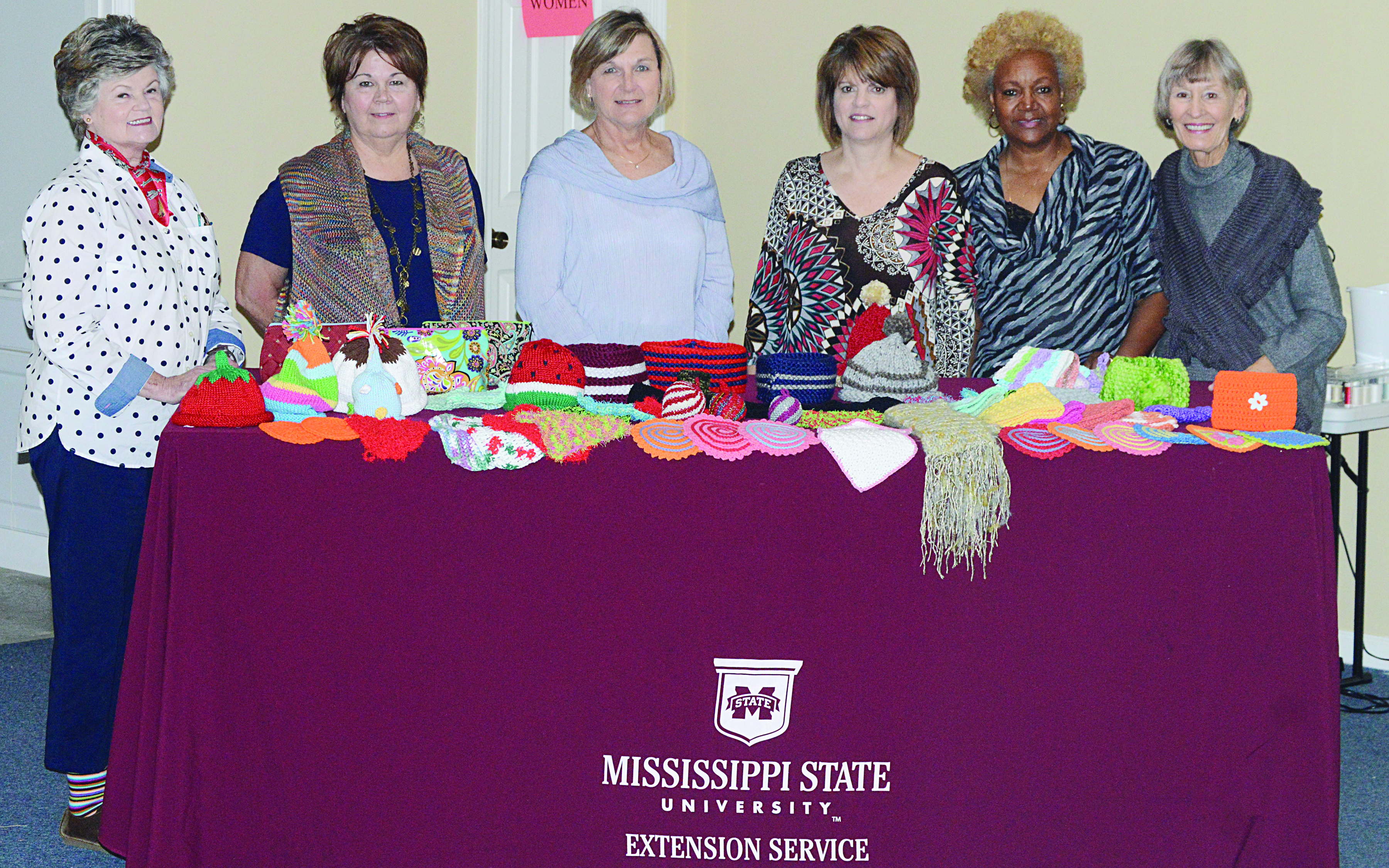 The Sunflower Stitchers, an affiliate of the Mississippi State Extnsion Service, will have a booth at the Delta Holiday Marketplace at the Indianola Country Club Nov. 15-16 to sell their hand-stitched items. Proceeds will go to the Humane Society. Pictured from left are Mary Dana Baird, Ann Twiner (Extension Agent), Debbie Woodruff, Debbie Poe, Jeannie Woodard and Laurie Noble. Noble is wearing a gray wrap that will be raffled at the event.