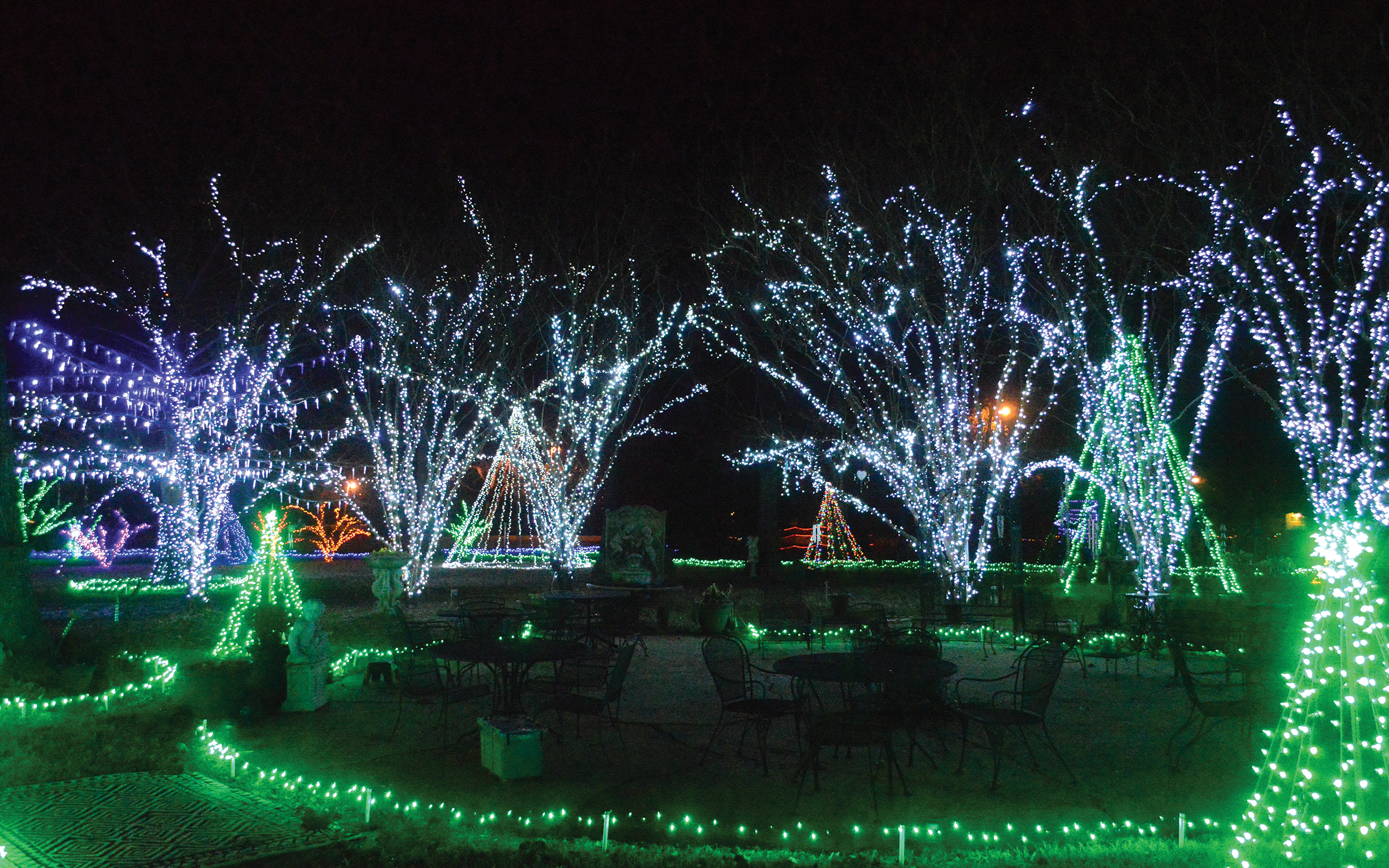 Proprietor Gail Oswalt is ecstatic that under the direction and creativity of Jimmy Lloyd the entire yard is covered with breathtaking groupings of vibrant lights in various forms.