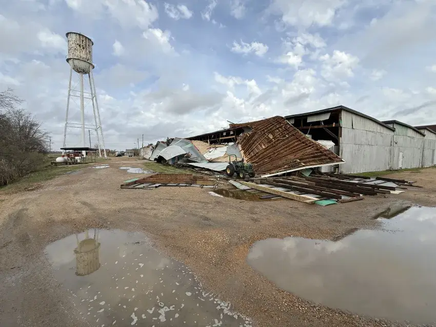 At 920 E. Grand Ave., the wind sheared the roof and siding off a large warehouse that is part of the local compress facility, exposing its wooden frame and scattering metal panels into nearby fields and roadways. Elsewhere, outbuildings were demolished, debris was driven into tree lines, and multiple utility poles were left leaning at precarious angles, draping power lines across lawns and blocking access roads.