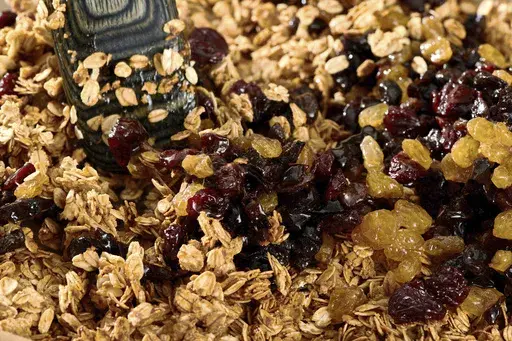 Because the dried fruit will burn if baked too long, add it to the oat mix only during the second part of bake time. Baking it lets it becomes chewy and incorporated into the mix.