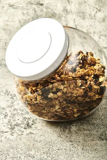 I like to package up this granola in clear glass Mason jars with attached lids, with cheery ribbons and labels. You can also find jars that have spoons attached.