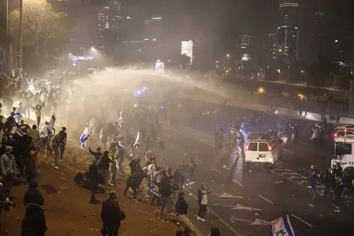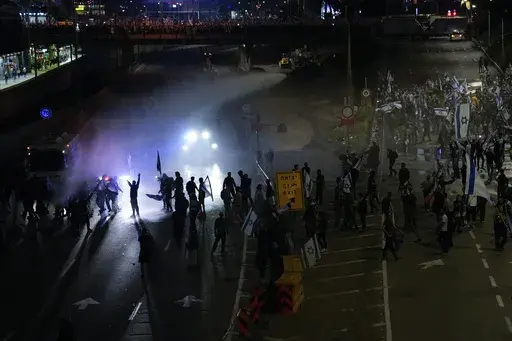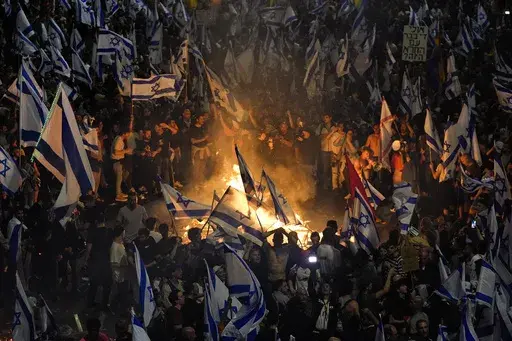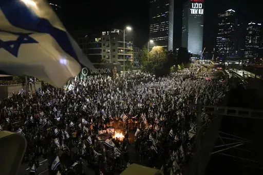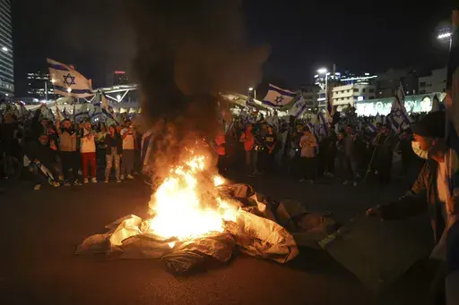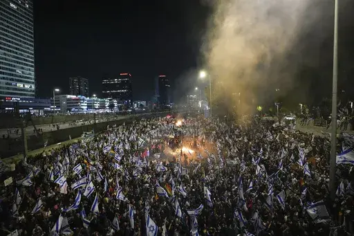 JERUSALEM (AP) — Tens of thousands of Israelis poured into the streets of cities across the country Sunday night in a spontaneous outburst of anger after Prime Minister Benjamin Netanyahu abruptly fired his defense minister for challenging the Israeli leader's judicial overhaul plan.