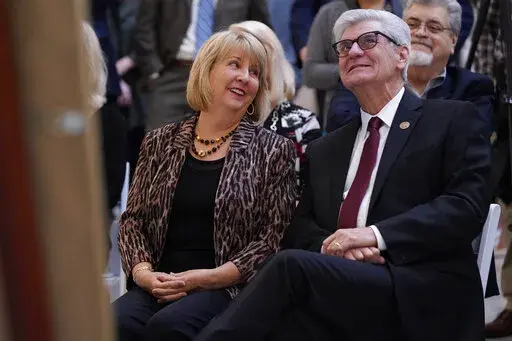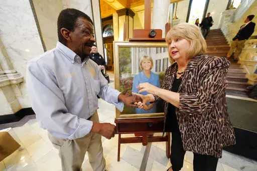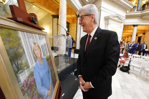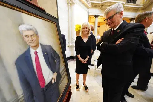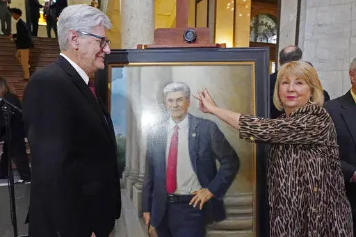 Republican current Gov. Tate Reeves and Democratic former Gov. Ronnie Musgrove were among the dozens of people who gathered inside the Capitol on Tuesday for the unveiling of portraits of Bryant and his wife, Deborah.