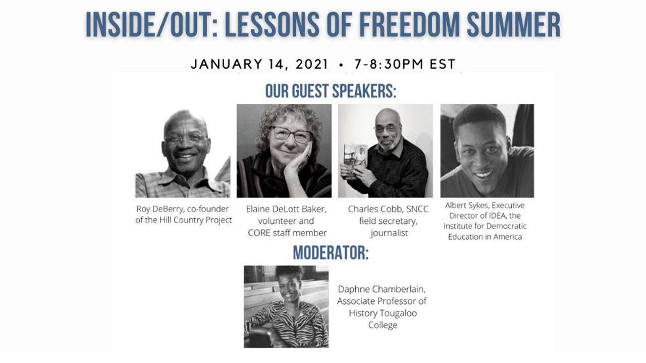 Speakers will include Freedom Summer participants, Roy DeBerry, Elaine DeLott Baker, and Charles Cobb, as well as Albert Sykes, Executive Director of IDEA (Institute for Democratic Education in America).