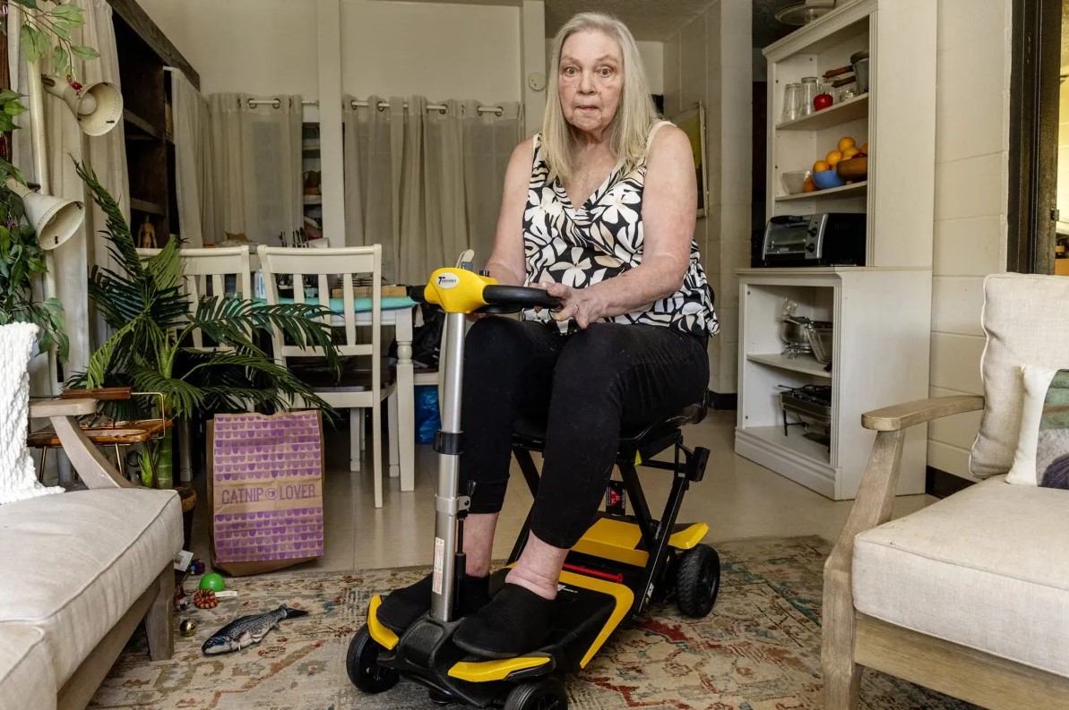 Bonnie Griffith prepares to sit in her motorized cart in her home in Clinton, Miss., on Monday, July 29, 2024. Griffith, who has severe neuropathy, missed four doctor’s appointments due to Modivcare’s transport issues with her cart. Credit: Eric Shelton/Mississippi Today