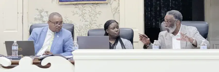 Indianola Mayor Ken Featherstone (left) and City Clerk Stephanie Washington (center) listen as Ward 4 Alderman Marvin Elder asks the board to go into executive session to talk about a $38,900 check deposit.