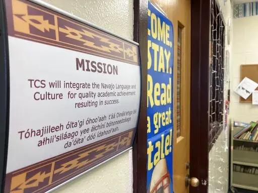 Generations of To'Hajiilee students have learned Navajo history and language in the school. Plaques outside classroom doors display the grade and subjects taught in Navajo, or Diné. Murals adorn hallways and posters remind students and teachers to integrate Diné as often as possible.