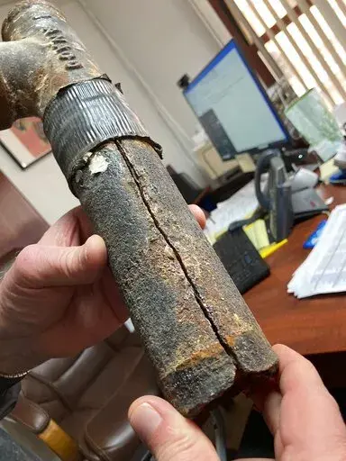Larry Holman, To'Hajiilee's administrative services specialist, picked up a section of broken bathroom piping that was sitting on a shelf in his office. It was thick with corrosion and had a crack running down one side — more evidence of the condition of plumbing throughout the school.