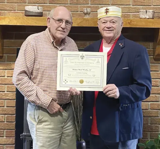 Thomas Oneil Whatley recently received his 50-year pin for his membership in the Scottish Rite. Joe Lee, right, presents the certificate to Whatley during a recent ceremony.