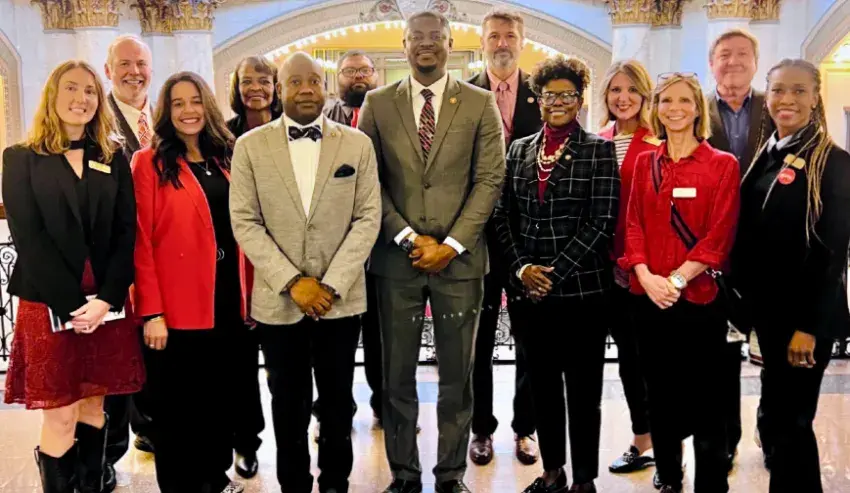 Mississippi Delta Community College administrators and faculty visited with Senator Derrick T. Simmons and Senator Sarita Simmons on Tuesday, February 11, 2025. Pictured are (front, left) Allison Folk, Dr. Valarie Morgan, Senator Derrick T. Simmons, Mississippi Delta Community College President Dr.