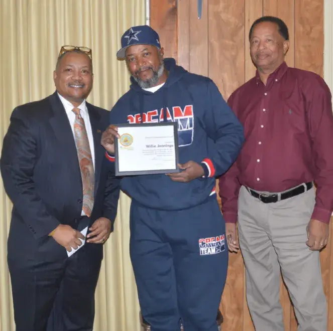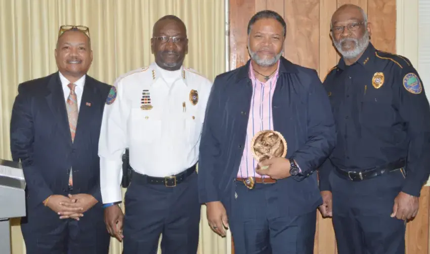 Indianola police investigator Irish Johnson was named IPD”s Officer of the Year for 2024. He accepted the award during Monday’s board of aldermen meeting. Pictured are Mayor Ken Featherstone, Chief Ronald Sampson, Johnson and Assistant Chief Ernest Gilson. Photo by Bryan Davis