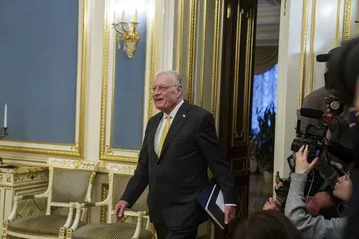 Dozens of journalists gathered at Ukraine's presidential office in Kyiv after being invited to take photos and observe a news conference with Zelenskyy and Kellogg. As the meeting began, photographers and video journalists were allowed into a room where the two men shook hands before sitting across from each other at a table.