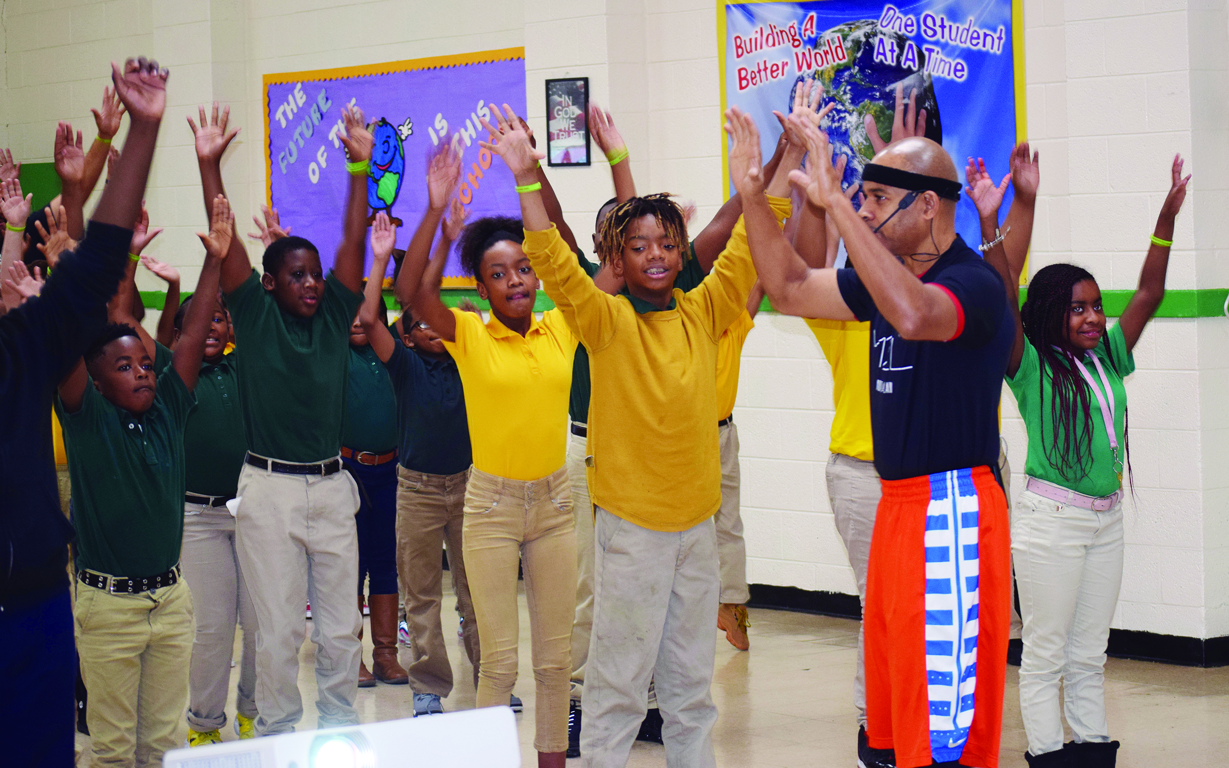 Coach Larry Calhoun, the star of the Move to Learn exercise break videos, visited the campus of East Sunflower Elementary School on Thursday to introduce administrators, teachers and students to the Move to Learn Initiative.