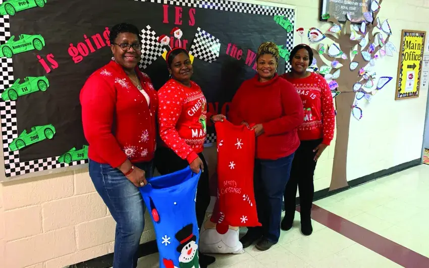 Inverness Elementary School Principal Brenda Singleton and Secretary Elizabeth Steen accept the gifts and toys from Sunflower County Sheriff’s Department Payroll Clerk Brandi Howard and Deputy Felecia Jordan who traveled the length of the county distributing the donations for students who otherwise might not have a joyous Christmas.