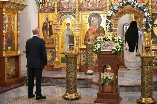 Russian President Vladimir Putin, also without a mask, attended a service at the Church of the Image of the Saviour Made Without Hands in Novo-Ogaryovo, outside Moscow.