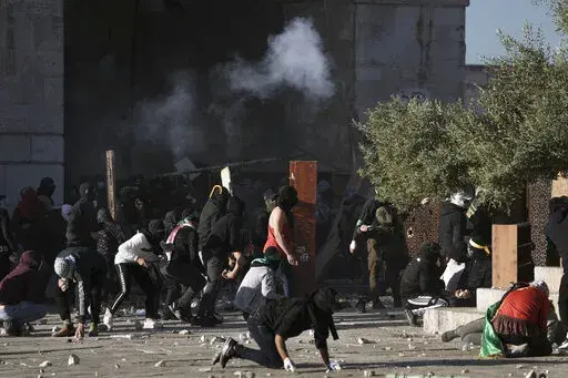 Palestinians threw rocks and fireworks, and police fired tear gas and stun grenades on the sprawling esplanade surrounding the mosque. Dozens of Palestinians barricaded themselves inside the mosque as they fought Israeli security forces.