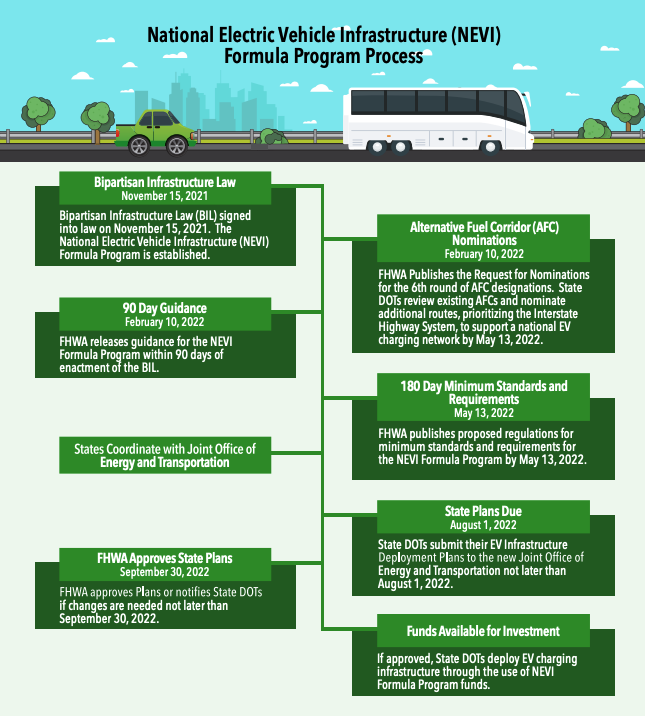 The National Electric Vehicle Infrastructure (NEVI) Formula Program is providing dedicated funding to states to deploy Electric Vehicle (EV) charging infrastructure and establish an interconnected network to facilitate data collection, access and reliability. Funding under this program is initially directed to designated Alternative Fuel Corridors for electric vehicles to build out this national network, particularly along the interstate highway system.