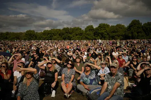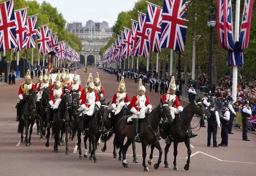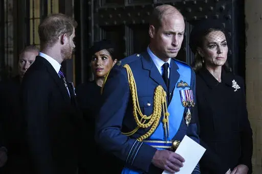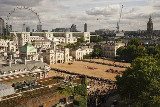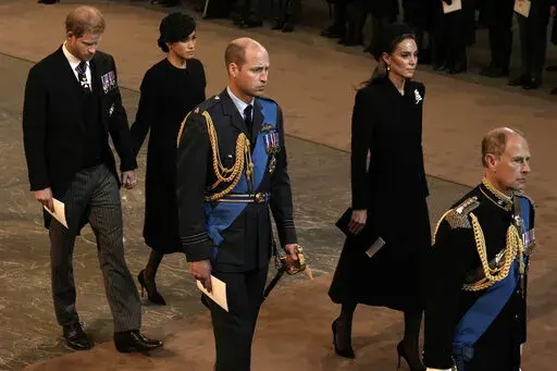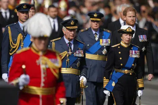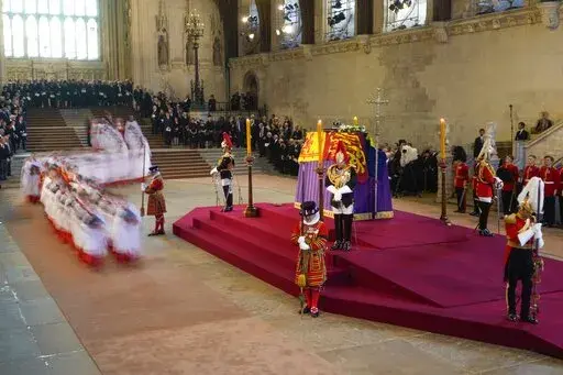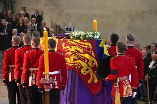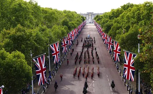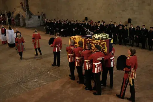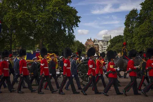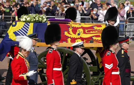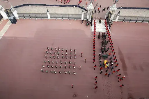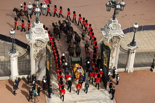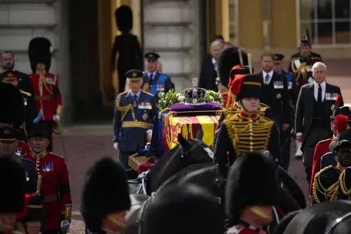 LONDON (AP) — The coffin of Queen Elizabeth II left Buckingham Palace for the last time Wednesday, borne on a horse-drawn carriage and saluted by cannons and the tolling of Big Ben, in a solemn procession through the flag-draped, crowd-lined streets of London to Westminster Hall. There, a steady stream of mourners paid their respects to Britain's longest-reigning monarch.