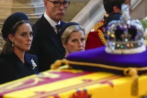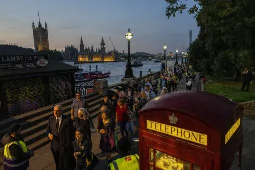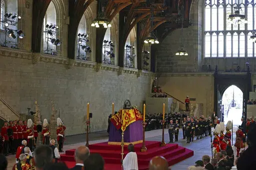 At 900-year-old Westminster Hall, where the queen will lie in state until her funeral Monday, crowds shuffled past her coffin well into the night. They moved silently down the steps of the hall under a great stained glass window, then past the coffin that was covered with the Royal Standard and had been placed on a raised platform known as a catafalque by eight pallbearers.