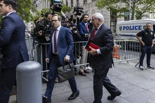 In the morning, Menendez, in a suit with a red tie, was dropped off in front of the courthouse at 8:15 a.m., 40 minutes before former President Donald Trump's motorcade passed by on its way across the street to state court, where he is on trial for allegedly falsifying business records to hide hush money payments to a porn actor before the 2016 election.