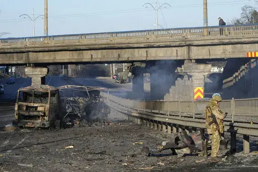 — Ukrainian soldiers evacuating an unmarked military vehicle damaged by gunfire in Kyiv, in the Obolon district about 10 kilometers (6 miles) north of the government quarter.