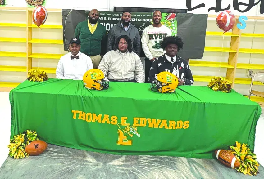 Thomas Edwards High School celebrated National Signing Day as three student-athletes took the next step in their academic and athletic journeys. Signing are seated, from left, Anthony Townsend, Jones College; and Darious Calvin and James Aricbald, both Coahoma Community College.