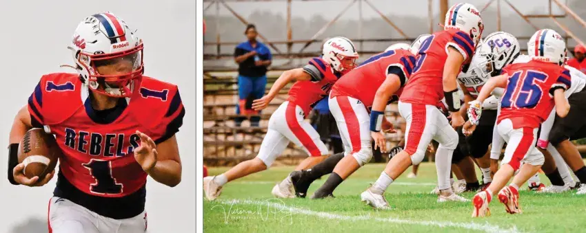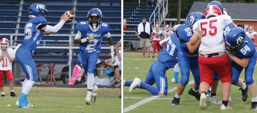 Indianola Academy’s junior high team got off to a fast start last week, defeating Carroll at home. Pictured above and to the left, quarterback Patrick Davis prespares to hand the ball off to No. 2 C.J. Neal. To the right, No. 51 Guy Robinson, No. 58 Caiden Worley and No. 54 Nicholas Patterson go in on stop. Photos by Channan Rainey