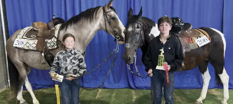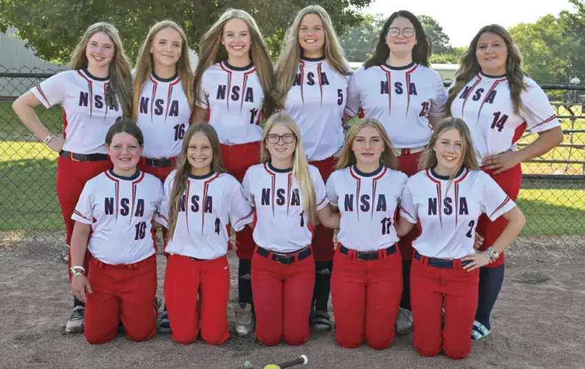 The North Sunflower Academy 2025 softball team is ready for the first pitch. Kneeling are Mari Lynn Cooper, Everett Robinson, Molley McKee, Paisley Parker and Skye Holmes. Standing are Chloe Horton, Tiffany Mitchell, Addy DeBower, Cailee DeBower, Kylie Weeks and Gracie Wooten. Photo by Vikki Peay