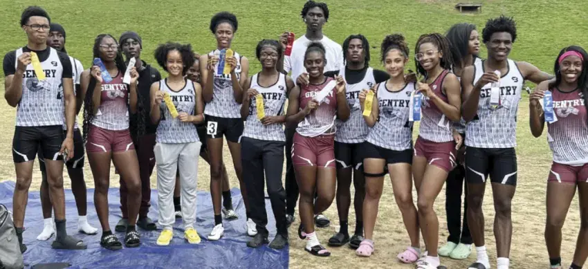 Pictured are members of the Gentry High School track and field teams. In the front row are Will Barnes, A’Myah Golden, Ty’Reva Wright, Rhinya Ginn, Zaniyah Porter, Madison White, Allison Gilson, Jordyn Oliver, Daniel Richardson and J’Niya Miller. In the second row are Justin Minton, Avion Eiland, Akeelah Cobbins, Adarian Gooden, Jacorey Courtney and Chikhyra Smith.