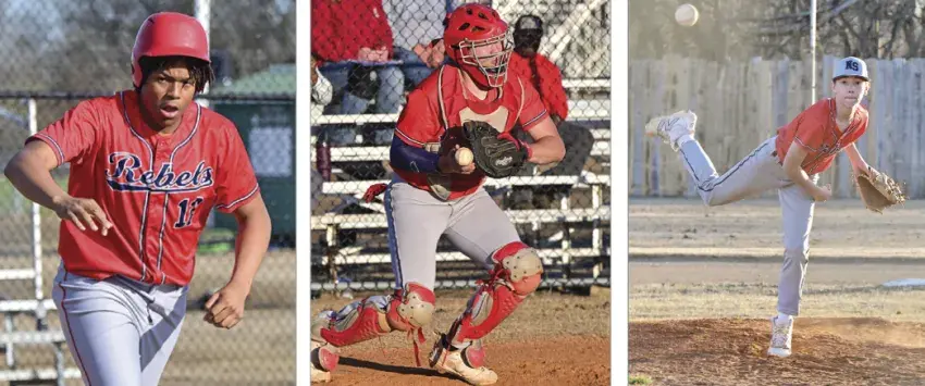 Pictured left, Bryce Redwine makes a play from home plate against St. Joe. Right, Avritt McNutt warms up to pitch for the Rebels vs St. Joe. Photos by Vikki Peay