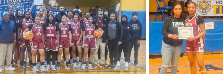 The Lady Rams of Gentry High School with the coaching and support staff. In the back row are Richard Washington, Kaitlyn White, R'Kalyn Lee, E'Miya Allen, Rasiyah Jackson, Calaeia Edwards, Coach Cary Hodges, Coach Tyandrea Williams, Kiara Jones (scorekeeper) and Demarco Marshall (manager).